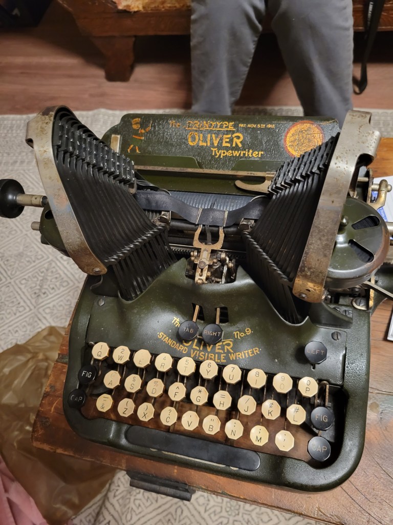 After I cleaned my Remington up, I remembered my father had his grandfather’s typewriter, so naturally I offered to adopt it and use it. This one is older than the Remington by about 20 years; it’s an Oliver no. 9 and despite some alignment adjustments needing to be made for the letters to all be on the same line, also works quite well.